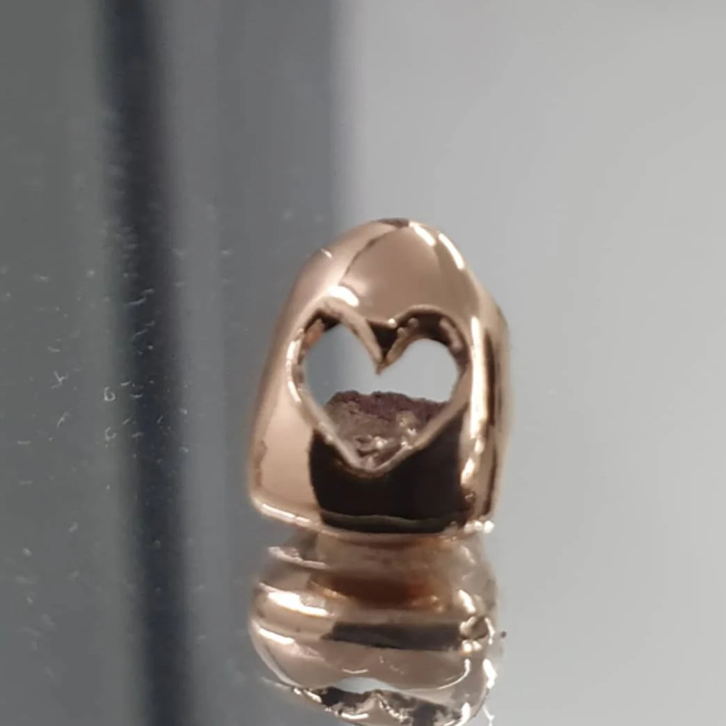 Heart Window Design Cap covers one tooth and you can choose any tooth on your top or bottom 8. The design is available in silver, yellow or white dental gold, 10k, 14k and 18k solid yellow, rose and white gold (not plated). Our quality is guaranteed and comes with a standard shiny/ mirror finish. To add more caps, select the quantity and specify which teeth you want made.